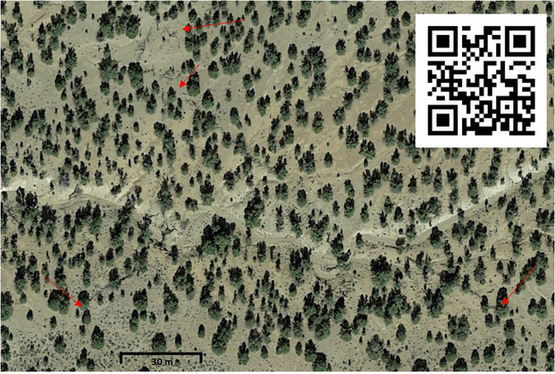 The Hamlin Valley Trap Site is a keyhole shaped game-drive structure that was used for communally hunting pronghorn. It is situated within pinyon-juniper woodland in western Utah and is constructed of juniper trees, of which most were cut with a metal-axe, indicating a post-contact (post-1770s) construction. The structure consists of a relatively small corral (20 m diameter) with two associated fences extending to the south and forming a “V”. The western fence is 100 m long while the eastern fence is about 150 m long (Figure 2). The corral consists of roughly seven charred trees that are standing or laying on the ground in a circle while the drivelines are constructed of juniper trees and branches stacked 20 – 110 cm tall. The eastern driveline has a large gap (about 55 m) that is likely a result of erosion over time. Artifacts identified at the site include two chipped stone flakes (related to stone tool manufacture) and a metal file (Figure 3), but it is unclear if these three items are related to communal hunting activities.